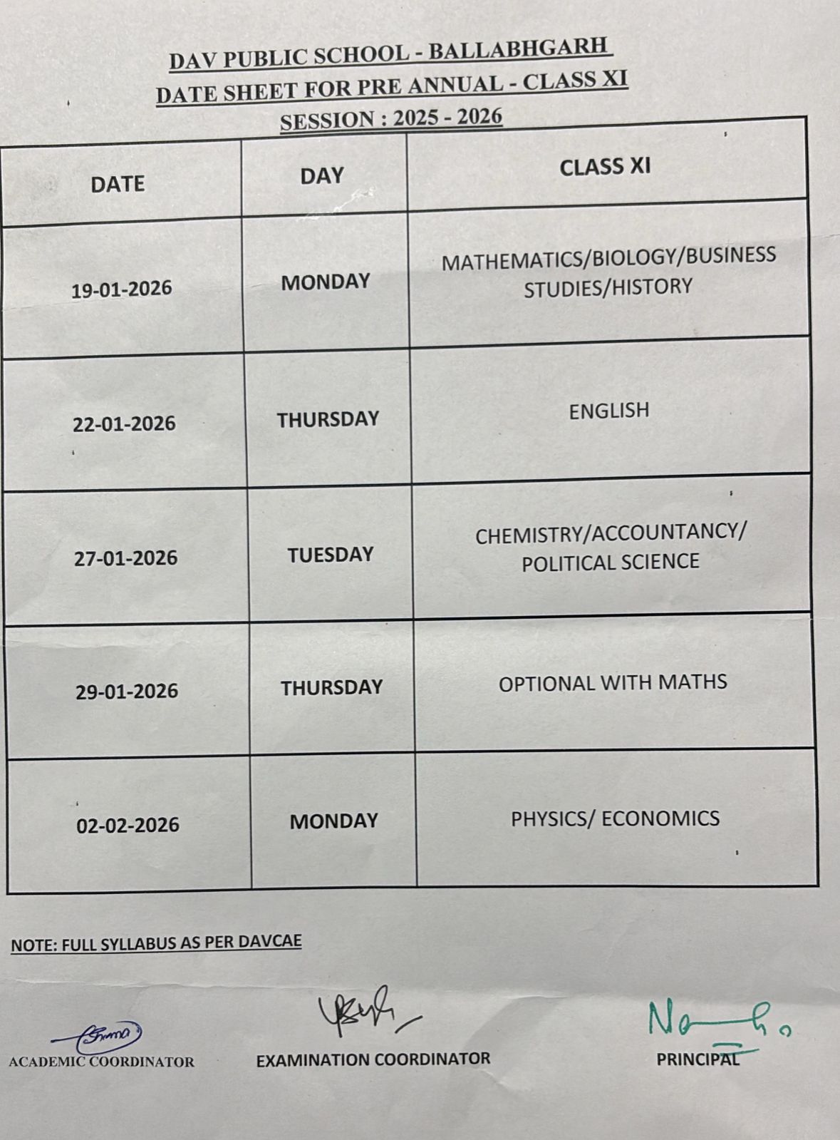 DATE SHEET - PRE ANNUAL ( CLASS XI )